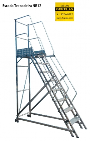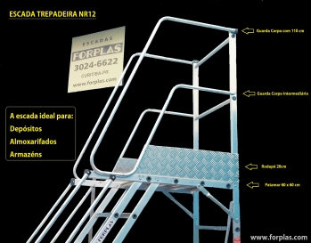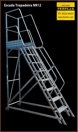 Escada Trepadeira Plataforma é a solução ideal para depósitos, armazéns e almoxarifados, onde se exige o atendimento à norma NR-12